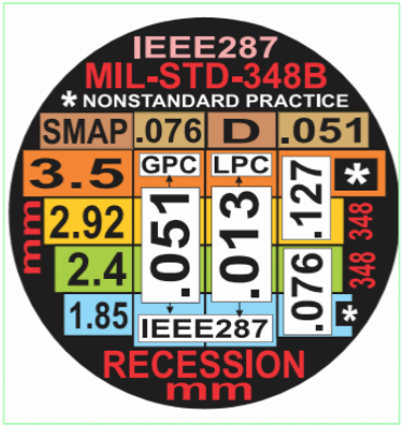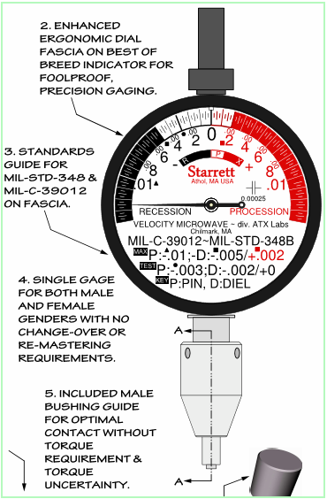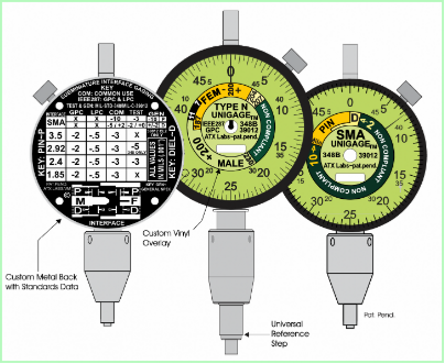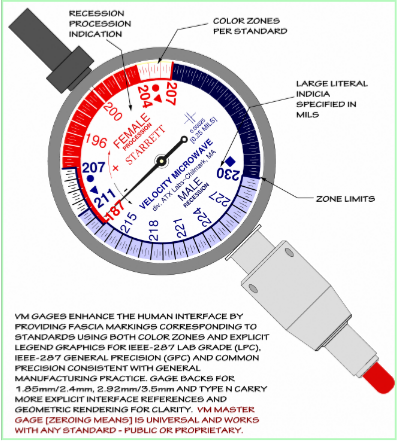Velocity Microwave attempts to make gaging both intuitive and unambiguous, and to that end has created a line of gages that carry tolerance zones relative to the different standards on both the dial face and the rear of the instrument. By the use of color coding, delineated compliance regions, and other graphics, the user can visually identify compliance by quick visual reference. This is a value added feature useful at the test bench and in a production setting.
