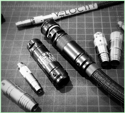 In the basic Velocity Microwave design, a stainless or Type III hard anodized grip form the bridge between connector and transmission line, locking both in a fixed relationship to avoid torsional forces. The means of achieving this in the actual engagement varies but the end result is the inhibition of torsional loads.